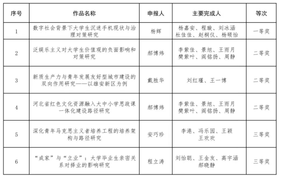 近日,由共青团河北省委、河北省社会科学院联合开展的2024年践行习近平新时代中国特色社会主义思想冀青工作调研大赛获奖名单发布。williamhill威廉希尔师生的6个项目获奖,其中,一等奖1项,二等奖3项,三等奖2项。本次调研大赛紧紧围绕保持和增强共青团政治性、先进性、群众性这一根本目标,广泛汇聚各方智慧,着力破解一批当前制约青少年成长发展、影响共青团改革与建设的重点难点问题。自2024年7月启动以来,我院高度重视,积极宣传动员,广大师生热情响应,踊跃参与,形成了一批有价值的调研成果,彰显了学院师生在新时代青年工作中的先锋作用。学院将坚持“大思政课”建设理念,把理论课堂与社会课堂结合起来,把教师主导与学生主体结合起来,持续引导广大师生关注现实问题,把专业优势转化为研究问题、破解问题的本领和能力,为河北青年工作、学校青年工作贡献“马院力量”。